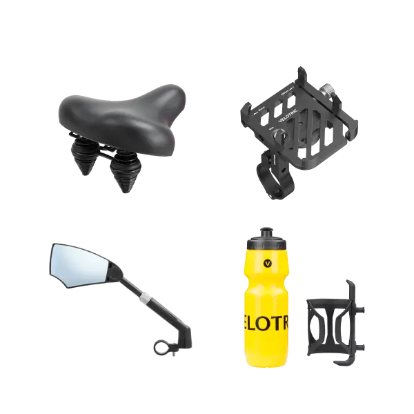 Battery, Charger, Front Light, Display, Front & Rear Fenders, Rear Rack, Front & Rear Reflectors, Bell, Cable Binder, Bike Kickstand and Left & Right Pedals